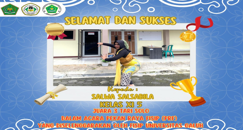 Prestasi membanggakan datang dari dunia seni tari, kali ini dari seorang siswi berbakat asal MAN 2 Ciamis, Salwa Salsabila. Dalam ajang Pekan Raya FISIP Universitas Galuh 2025, Salwa berhasil meraih juara tiga dalam lomba tari solo yang diadakan di Aula FISIP Unigal. (5/2/2025).