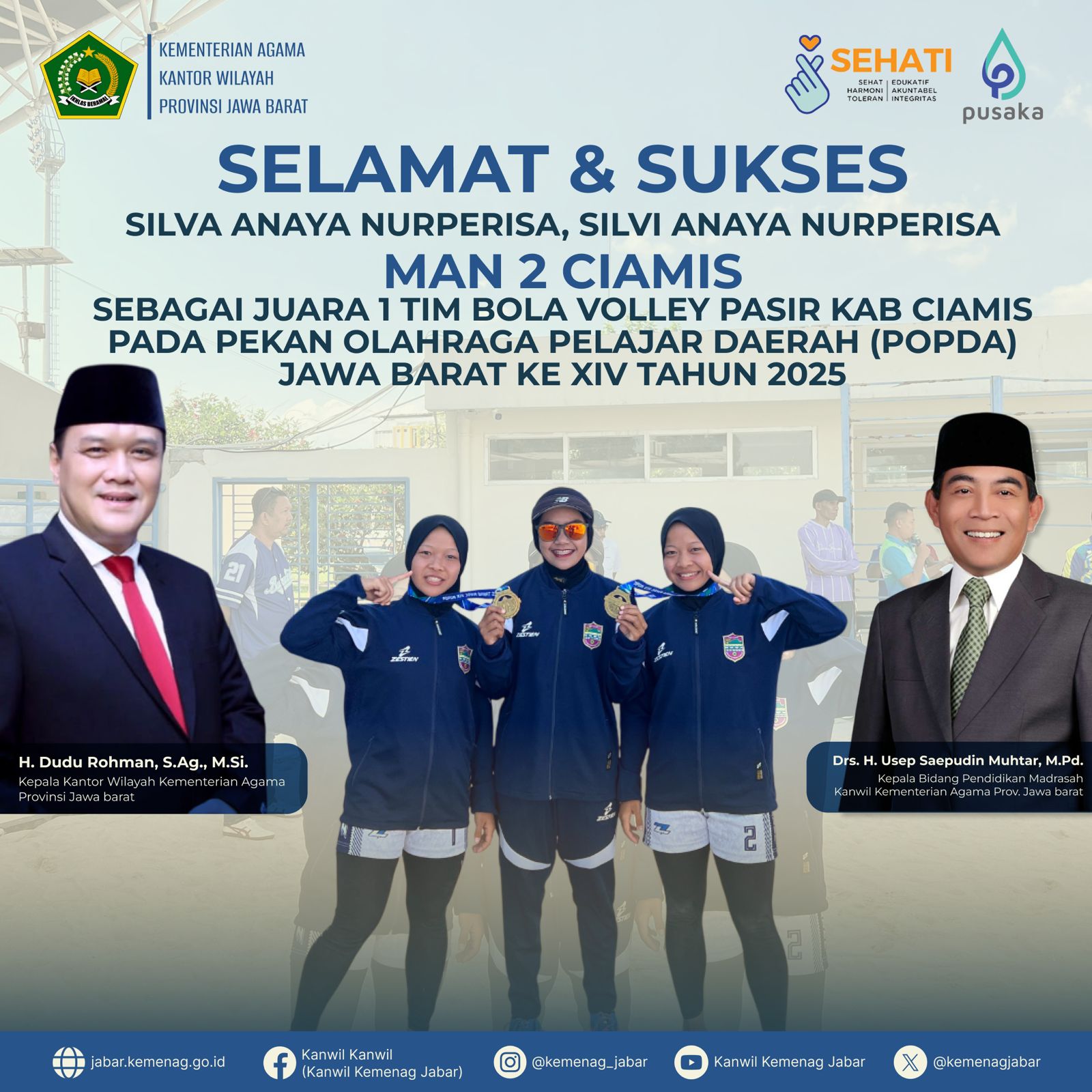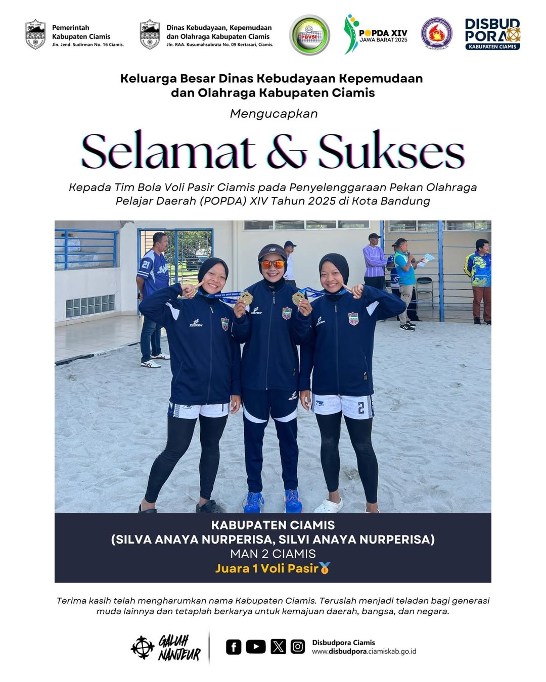 Madrasah Aliyah Negeri (MAN) 2 Ciamis kembali mencatat sejarah prestasi membanggakan melalui siswi kembarnya, Silva Anaya Nurperisa dan Silvi Anaya Nurperisa. Duo atlet muda ini sukses merebut medali emas cabang olahraga bola voli pasir putri pada ajang Pekan Olahraga Pelajar Daerah (POPDA) XIV Jawa Barat 2025.