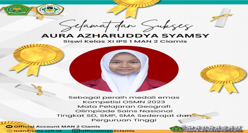 Babak final Olimpiade Sains Nasional (OSN) 2023 jenjang SMA/MA yang digelar pada 14-15 Nopember 2023 melahirkan para juara, termasuk siswa Madrasah Aliyah Negeri (MAN) 2 Ciamis. Suatu penghargaan dan apresiasi diberikan kepada Aura Azharuddya Syamsy siswa kelas XI IPS 1 MAN 2 Ciamis ini karena telah meraih medali emas pada mata pelajaran Geografi Kompetisi OSMN 2023