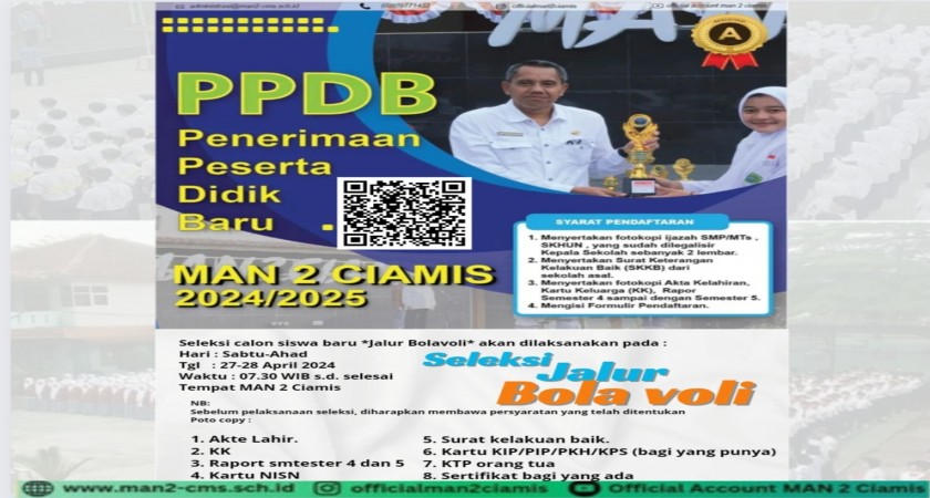 Sebelum pelaksanaan seleksi, diharapkan sudah terdaftar sebagai calon siswa baru MAN 2 Ciamis, dengan melengkapi persyaratan yang telah ditentukan sbb: